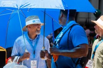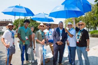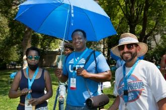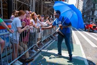 UFT members, including special education teacher Christopher Townsend (with umbrella), make sure to be shaded while taking in the parade honoring frontline workers during the hot summer day on July 7.