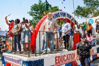 The UFT float, with President Michael Mulgrew (front right) aboard, begins its turn up Broadway.