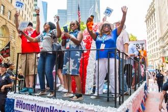 Confetti rains down on Department of Education Chancellor Meisha Porter (fourth from left) on the UFT float.