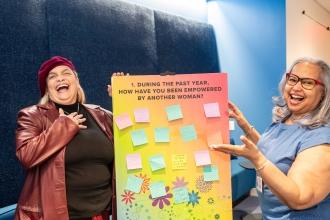 Edith Lopez (left), the paraprofessional representative at PS 68 in the Bronx, and UFT Bronx Special Representative Bonnie Rodriguez celebrate women’s empowerment.