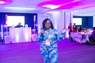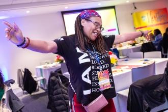 Paraprofessional Chamaine Smith-Lyons of PS 70 in the Bronx enjoys the tunes spun by the DJ at the HERstory brunch.