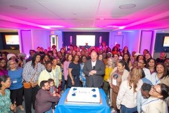 Happy Birthday, UFT! HERstory brunch attendees, led by Mulgrew (center), take time to acknowledge the UFT’s 65th birthday, which occurred March 15, the same day as the brunch.