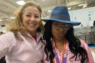 Teacher Lucy Merlino (left) and Chapter Leader Michelle Croft of PS 65 in the Bronx take a selfie showing their support for the fight against breast cancer.