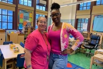 Paraprofessional Vivian Otero (left) and pre-K teacher Latisha Harley are all smiles at PS 65 in the Bronx.