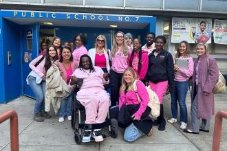 Staff at PS 752 Queens Transition Center gather for a group photo showing off their pink apparel.