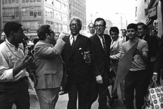 Civil rights leader Bayard Rustin (third from right) with UFT President Albert Shanker push through the crowd at a City Hall rally in September 1968.
