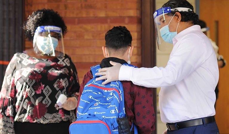 A FIRST DAY LIKE NO OTHER: PS 188 speech teacher Judith Wynter (left) and teacher Mario Gamez welcome a returning District 75 student on Sept. 21, the first day of in-person learning at their Bronx school.