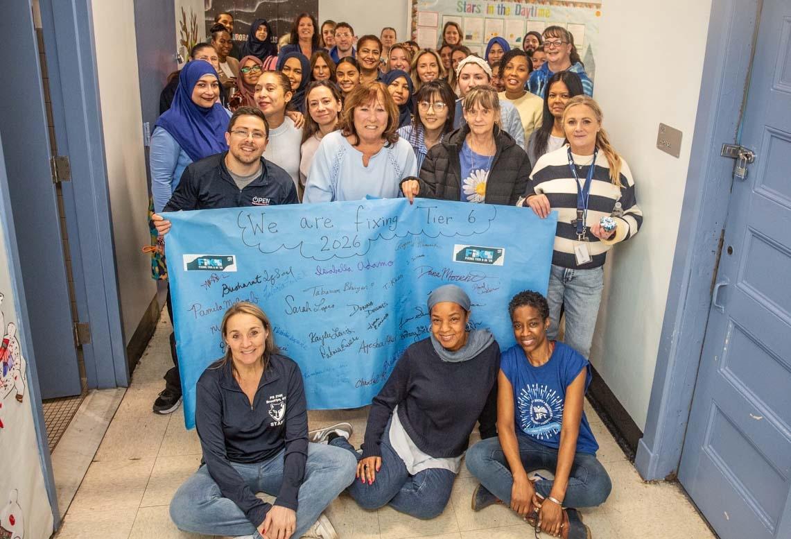 FIXIN' TO SECURE THEIR FUTURES: Teachers at PS 214 in Brooklyn gather with the pledge to Fix Tier 6 in '26 that they signed together as part of the citywide 1/6 day of action.