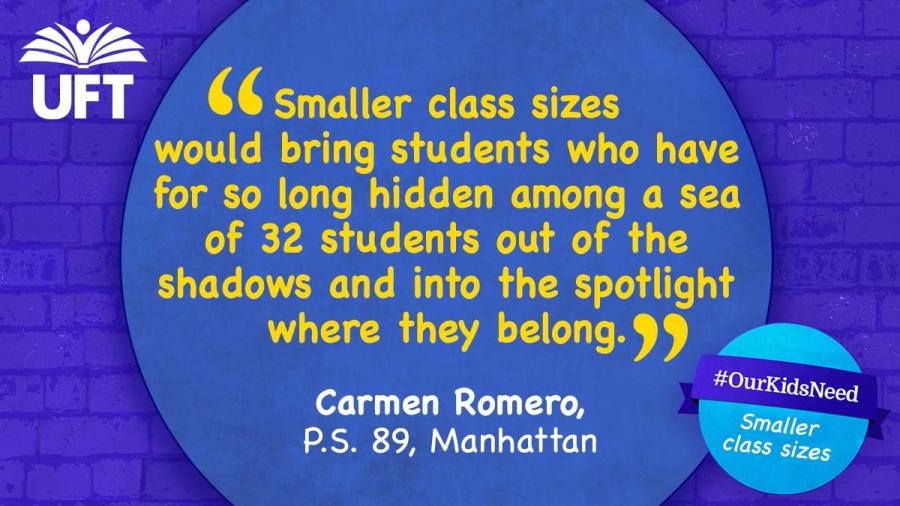 — Carmen Romero, PS 89, Manhattan - It's often frustrating to recognize how overcrowded classrooms limit our options in trying to reach every child to thoroughly meet their learning needs. Smaller class sizes for our city's public schools would reduce the risk of overlooking students with profound learning challenges or untapped potential.”