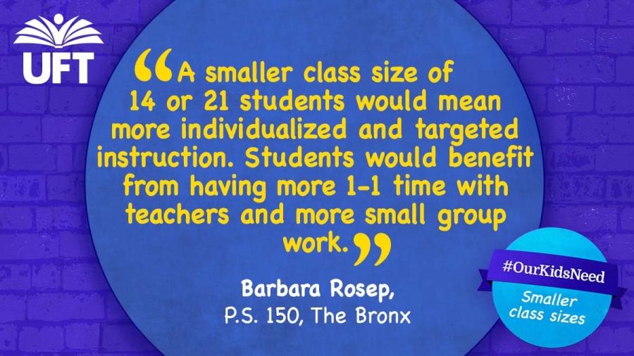 — Melissa Alvarez, John Bowne, HS, Queens - “Smaller classes would allow teachers to give their students more targeted instruction. Teachers are stretched thin every day to meet the academic needs of their students and with smaller class sizes we can make a more meaningful impact in the lives of students.”