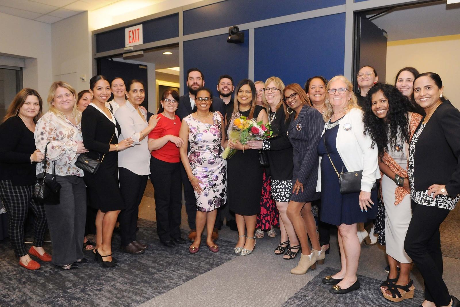 Members from MS 137 in Queens surround their school’s honorees — Amelia Rajkumar-Singh, Andrea Sitaram-Bhika (holding flowers) and Marisa Teitelbaum.