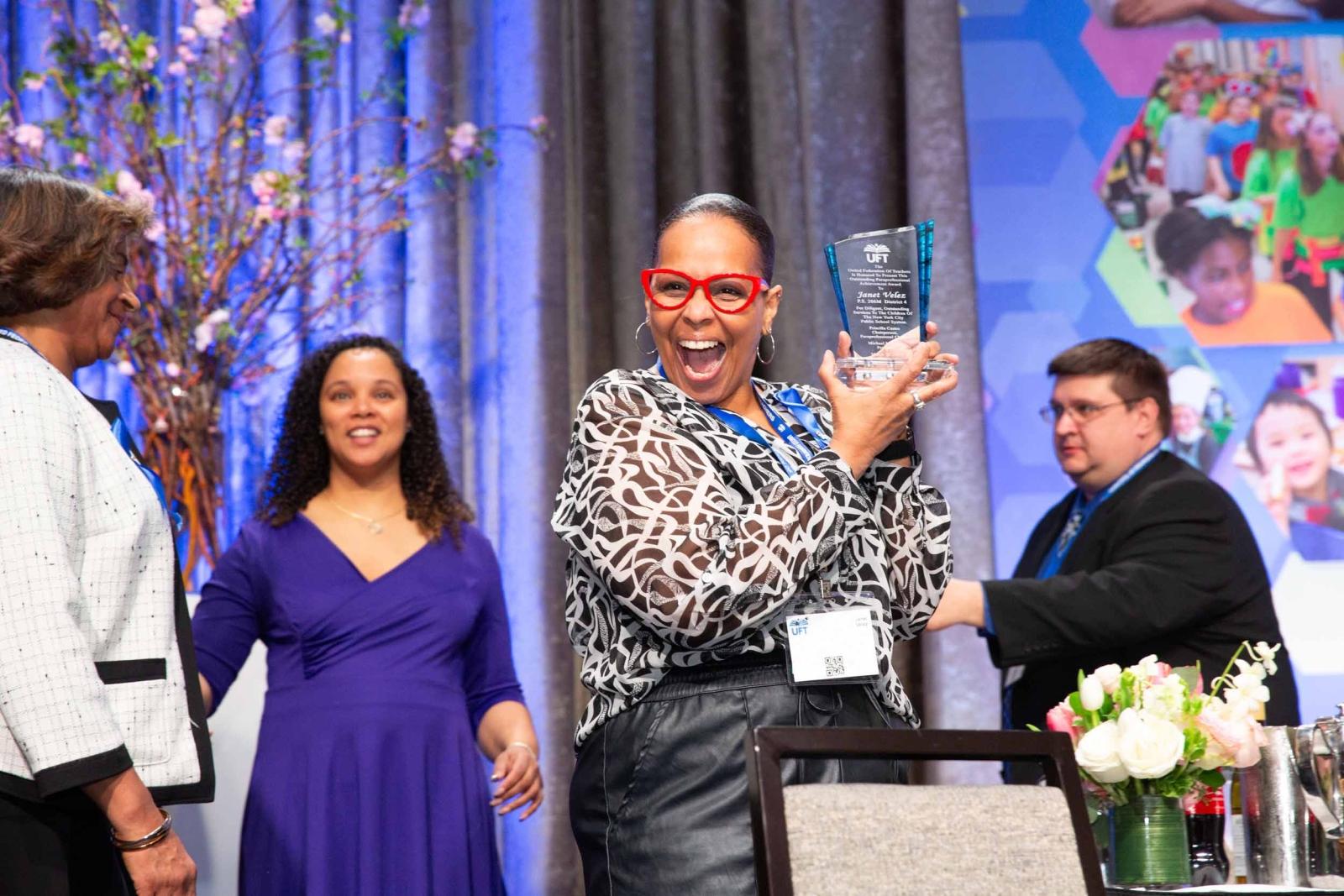 Paraprofessional Janet Velez of PS 206 in Manhattan beams as she shows off her award.
