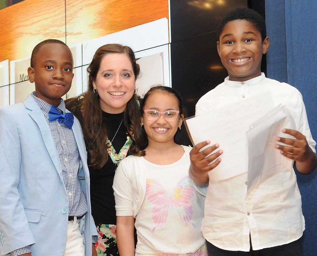 Sarah Wiesel, a speech therapist at PS 161 in Crown Heights, Brooklyn, and her students, whose separate “memoirs” of a frog, a penguin and a bunny earned them recognition at the event.