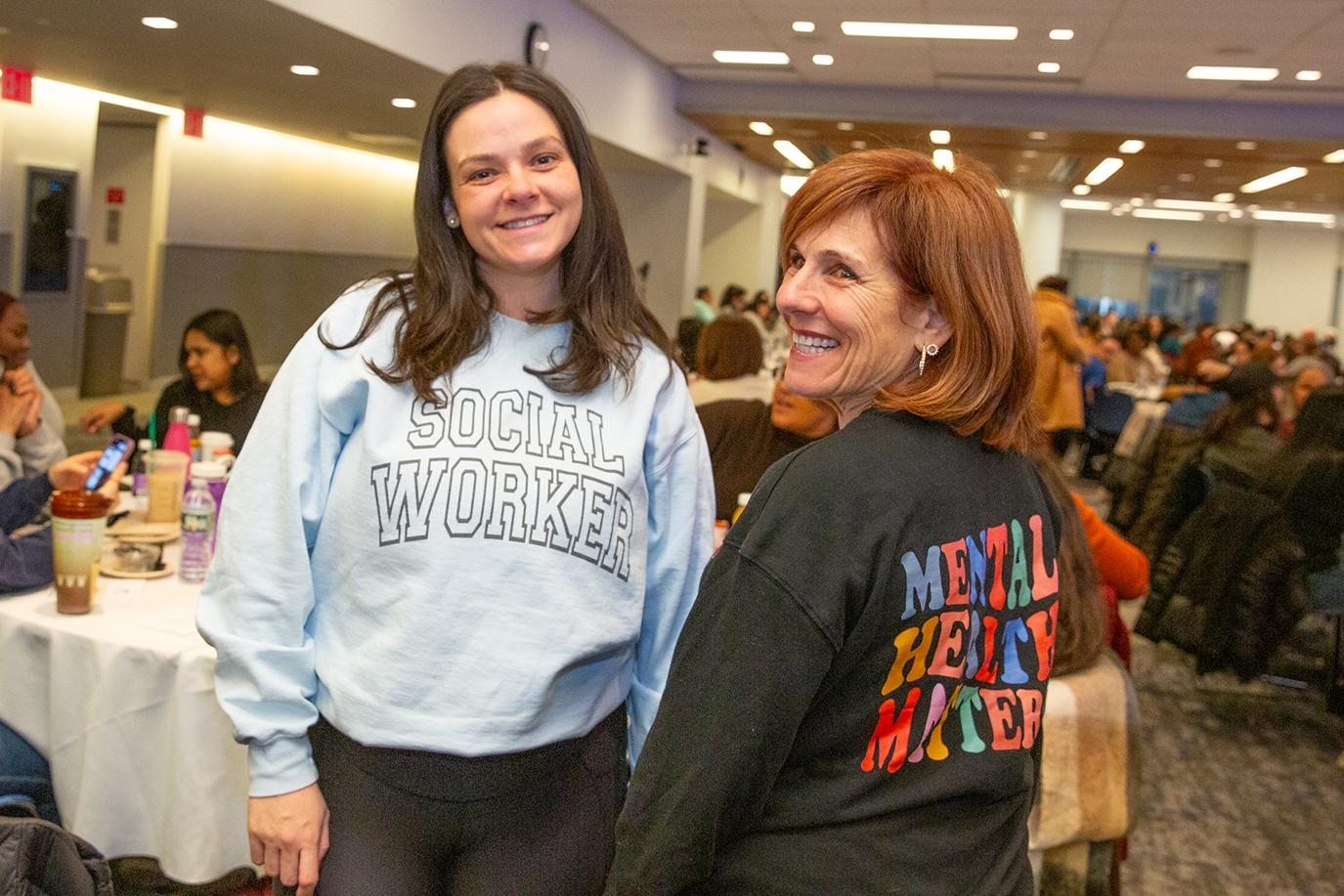Social Workers Victoria Biancarosa and Suzanne Fertig from PS 219 in Queens show love for their profession during the UFT's Clinicians Appreciation Day.