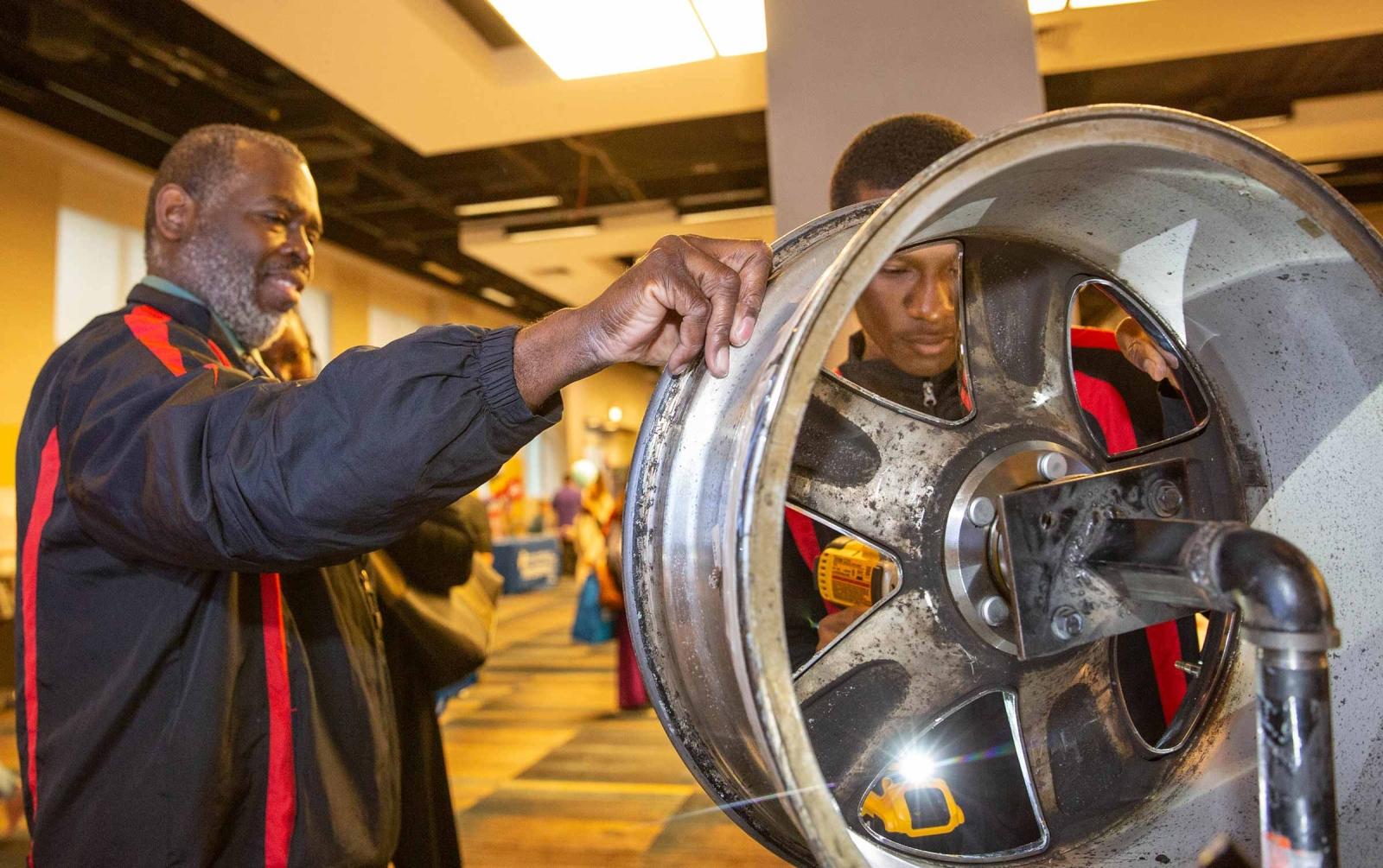 Joseph Marcus (left), a teacher of auto body repair and painting at Alfred E. Smith Career and Technical Education HS in the Bronx, and a student do some work at their exhibit.