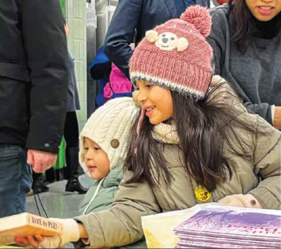 Two children happily make reading choices at a First Book giveaway at PS 33 in Manhattan on Feb. 4. At the Chelsea event, co-sponsored by the UFT and the AFT, 5,000 free books were distributed to students who are asylum seekers, recent immigrants or newcomers to New York City public schools. Each child was able to select five to 10 books to take home. The books were donated by the nonprofit First Book, which provides books for children who might otherwise not have access to them.
