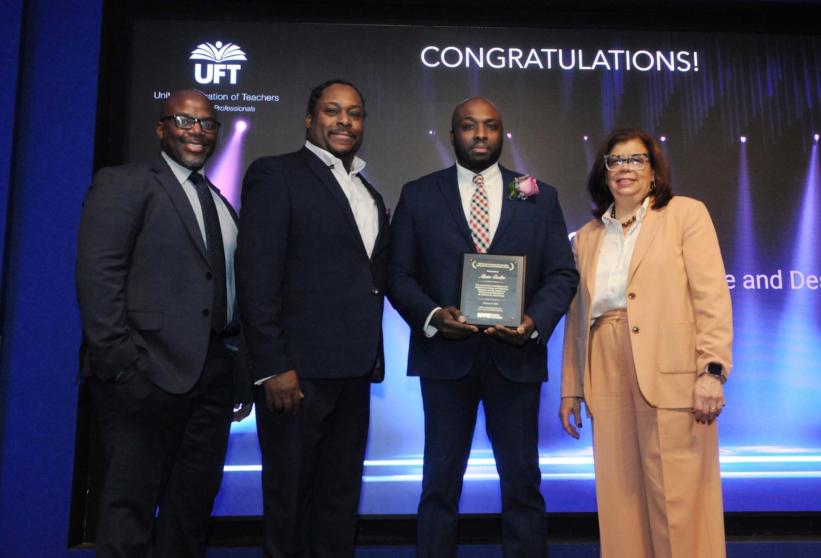 Manhattan CTE educators proudly hold their awards, which were presented by UFT Vice President for CTE High Schools Leo Gordon (right). The educators were among some 80 honorees citywide awarded during the program.