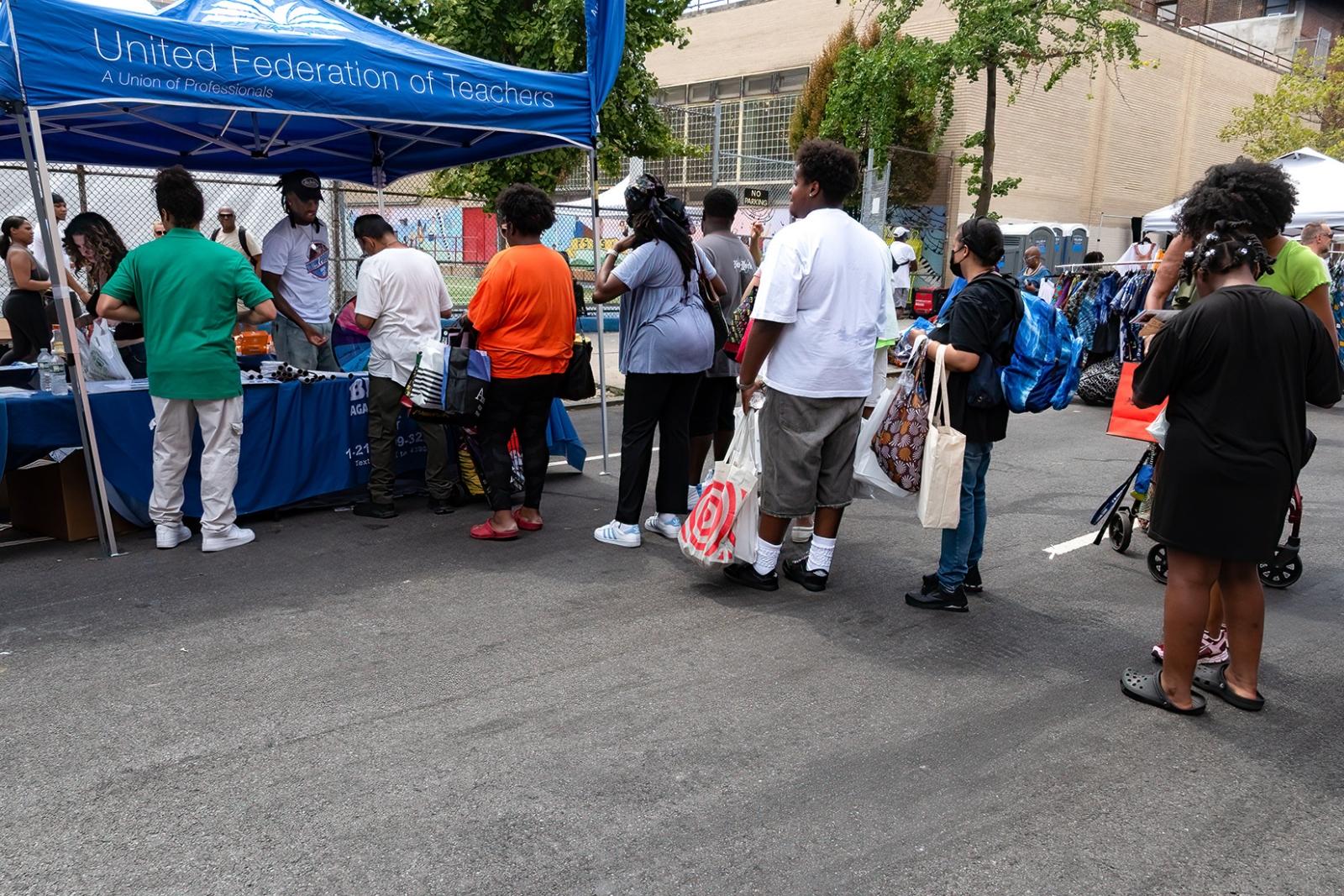 Families line up at the UFT booth during Harlem week festivities to receive backpacks filled with school supplies and information on parent resources.
