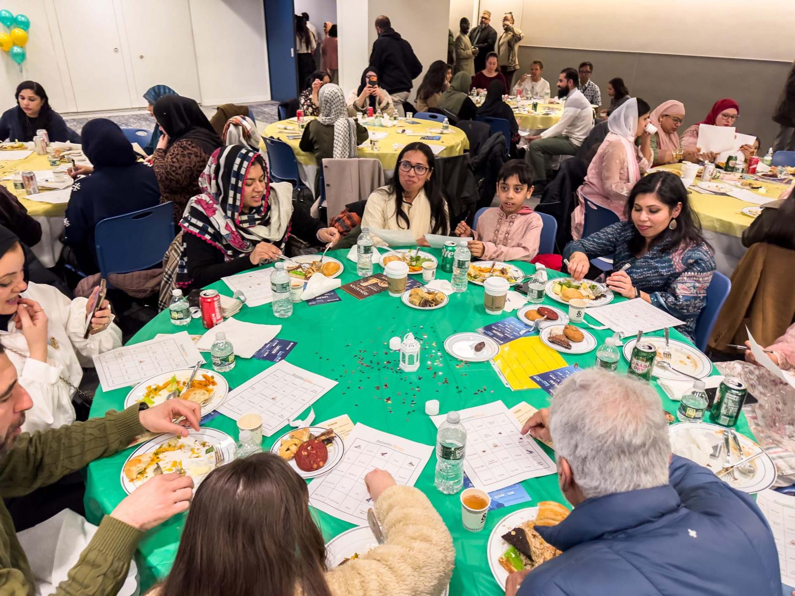 Members and guests play Ramadan-themed bingo as they share the Iftar meal, crossing off words related to their faith like "feast," "forgiveness" and "lantern."
