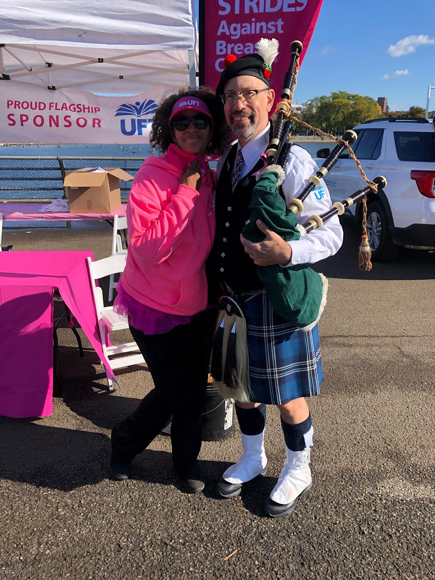 Queens Strides Coordinator Greer Hansen-Velazquez (left), with bagpiper Richie Niccolich, a teacher at PS 174 in Queens.