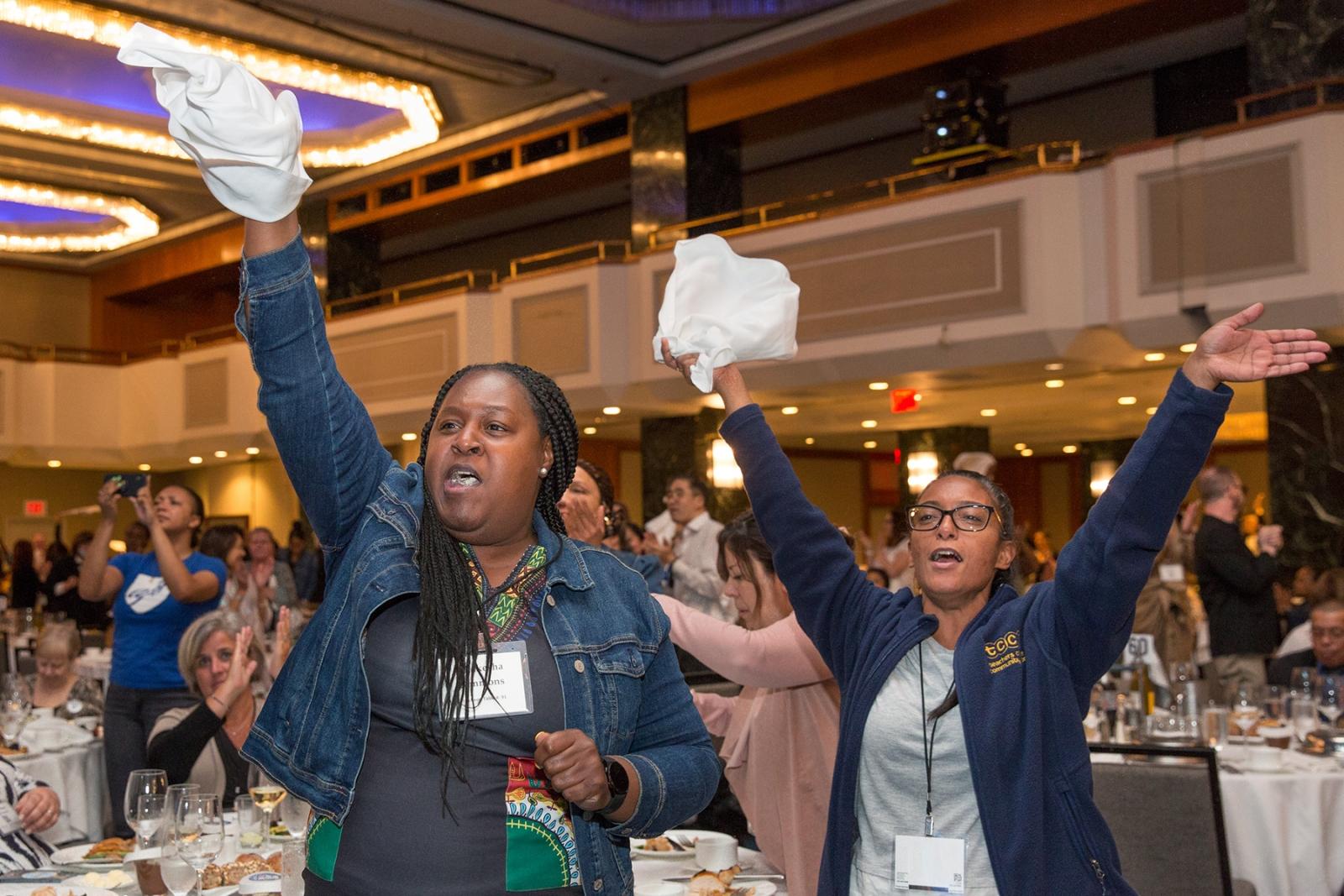 Pre-K teacher Shakesha Simmons (left) and paraprofessional Betty Checo, both from Teachers College Community School in Harlem, show their enthusiasm.