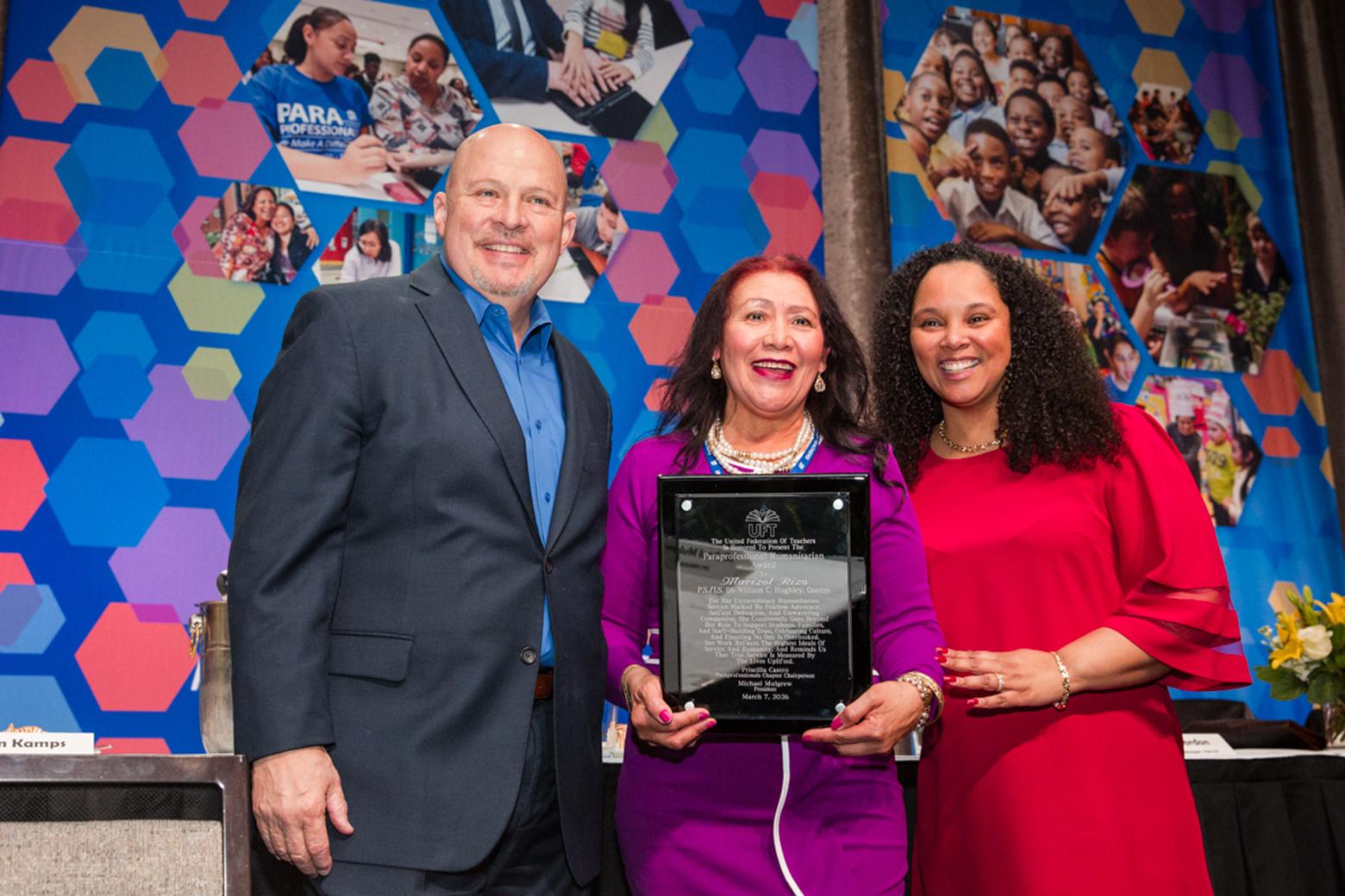 Marizol Rizol (center), the Humanitarian Award recipient, is flanked by UFT President Michael Mulgrew and UFT Paraprofessionals Chapter Chairperson Priscilla Castro.