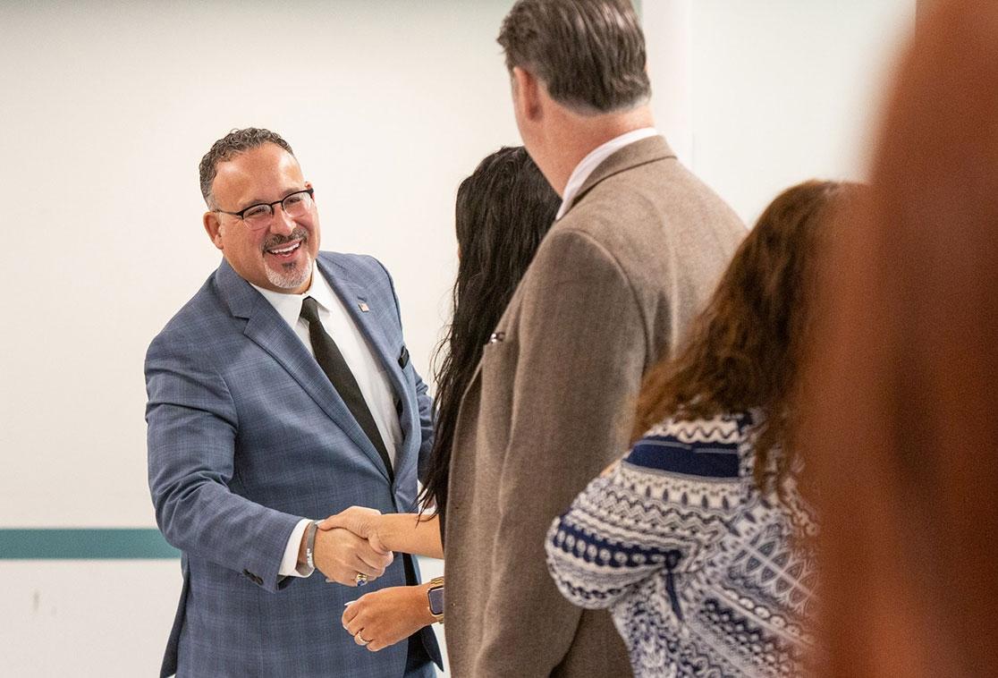 U.S. Secretary of Education Miguel Cardona arrives at UFT headquarters for a round- table on student debt and shakes hands with UFT members on the panel.