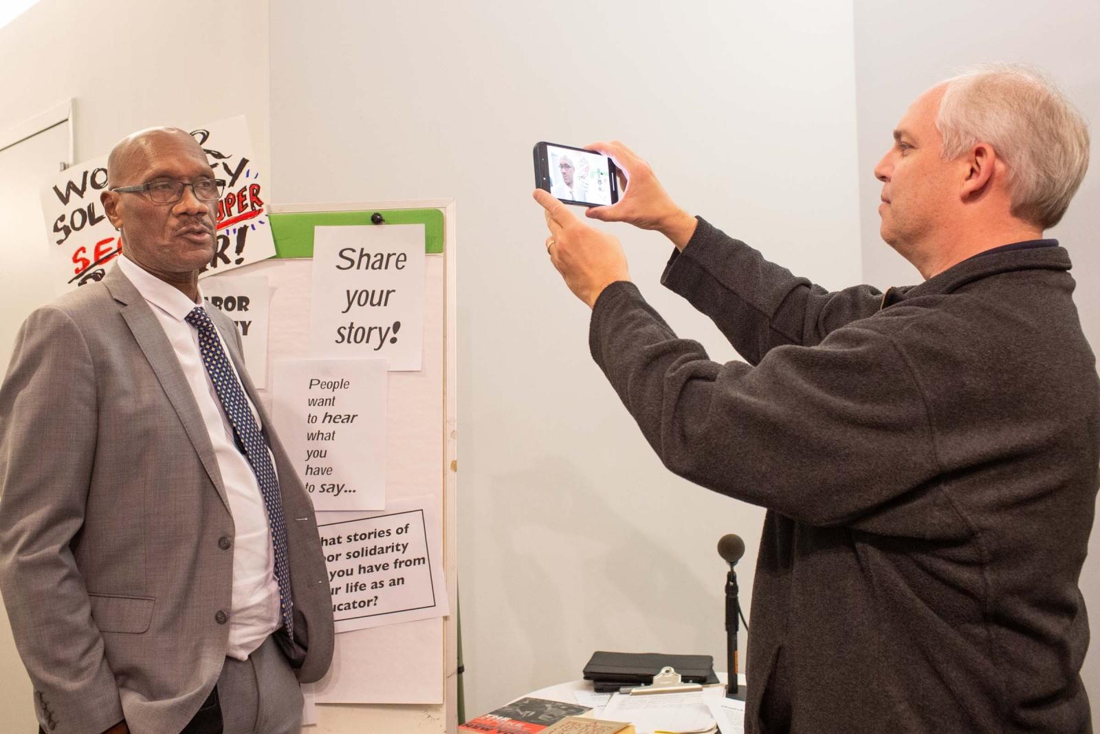 Retired speech teacher Clifton Sherman records his story of union activism for the RTC’s new Labor Solidarity Project at the luncheon.
