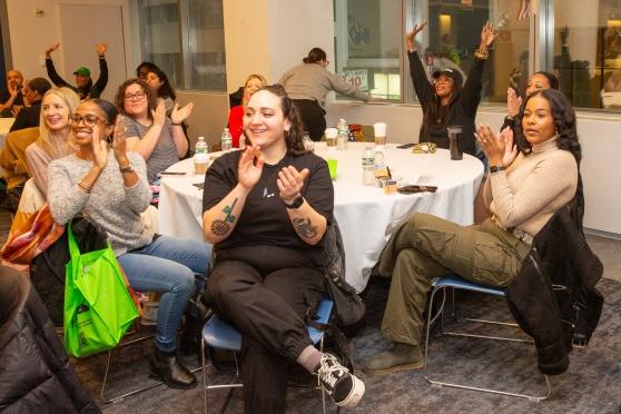 Social workers applaud Social Workers and Psychologists Chapter Leader Raul Garcia during his opening remarks.