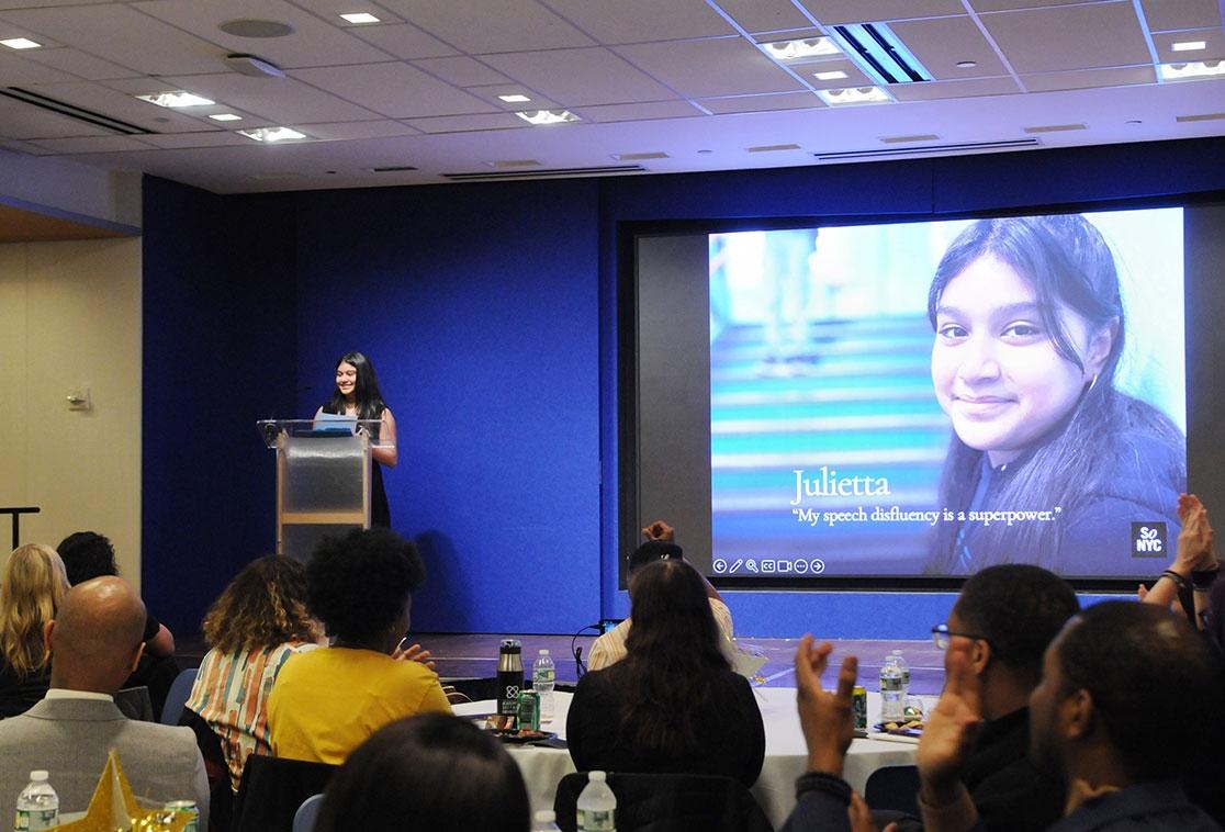 Julietta, a 6th-grader featured on Students of NYC, speaks at the initiative’s one-year anniversary celebration.