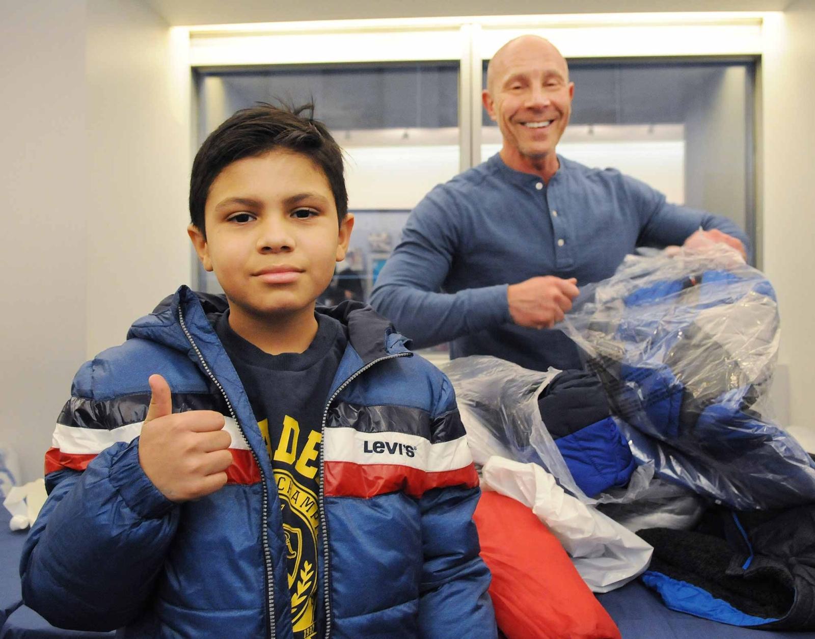 A 9-year-old gives a thumbs-up to the new coat he received at the UFT’s Thanksgiving Luncheon on Nov. 19 at union headquarters, while UFT Vice President for Middle Schools Richard Mantell, who coordinated the event, enjoys the child’s reaction.