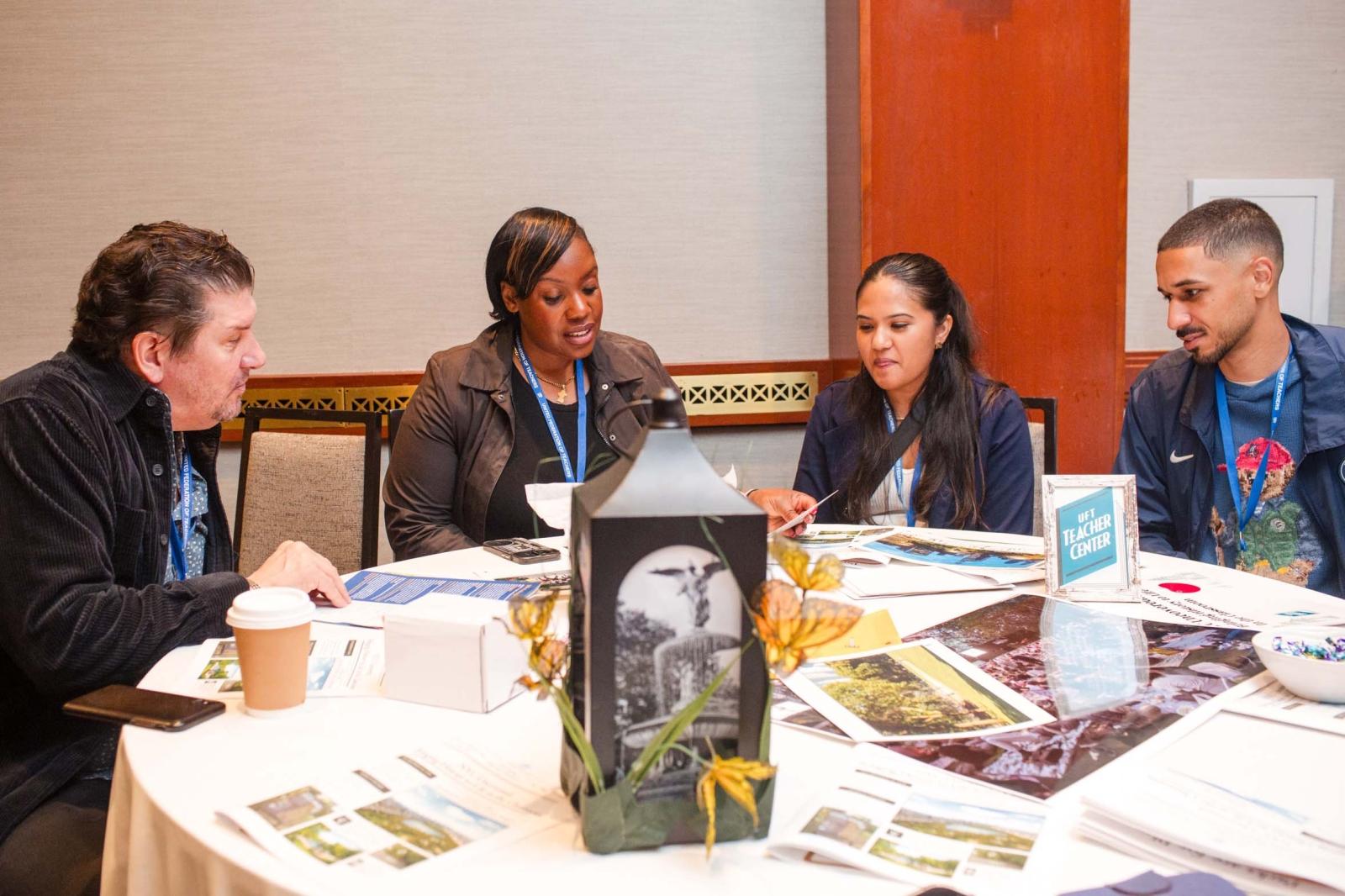 Collaborating during a social studies workshop at the conference are (from left) Ronald Micca, a teacher at the HS for Arts and Business in Queens, and pre-K teachers Malika Smith, Christina Udit and Stefon Pflum of the District 29 Pre-K Center in Queens.