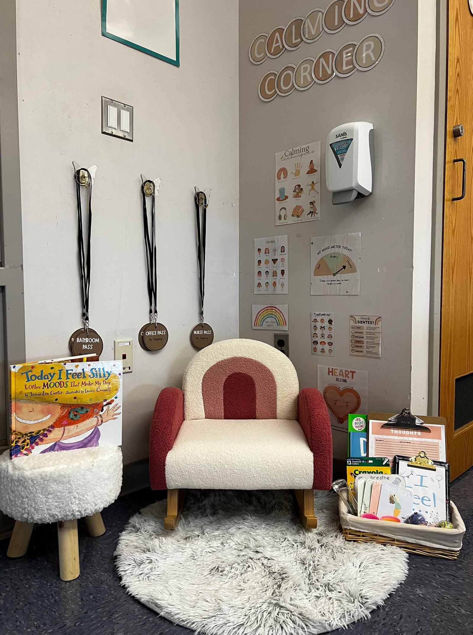 School can be hard sometimes. We all have bad days. I created a calming corner for when students need a little break. During instruction, if students need time for themselves, they just have to ask. I set a five-minute timer. How they choose to spend those five minutes in the calming corner is completely up to them!
