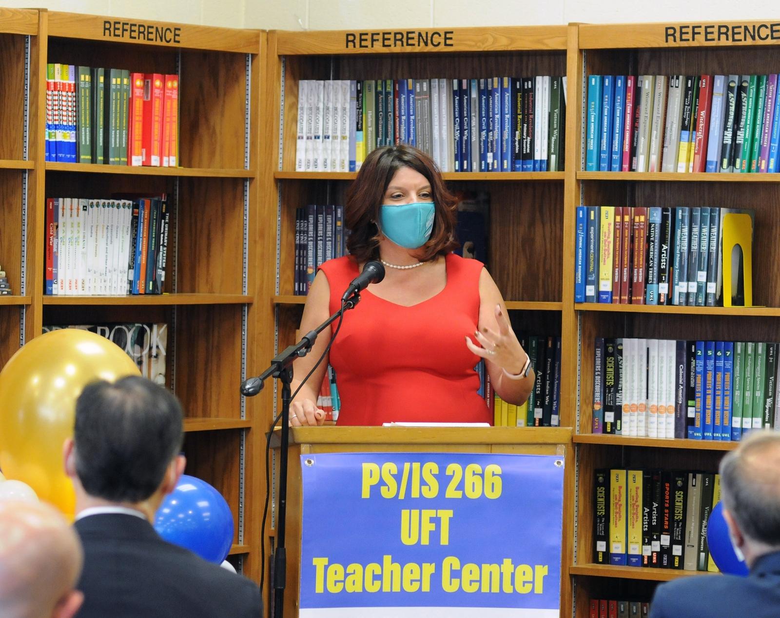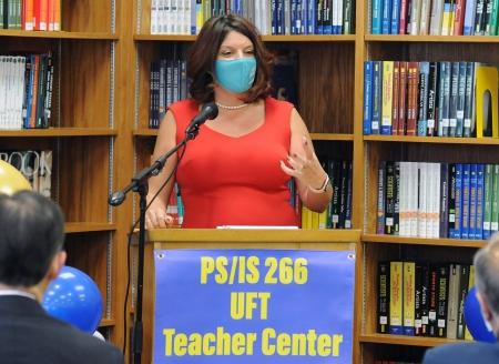 UFT Vice President Mary Vaccaro speaks at the official opening of the Teacher Center at PS/IS 266.