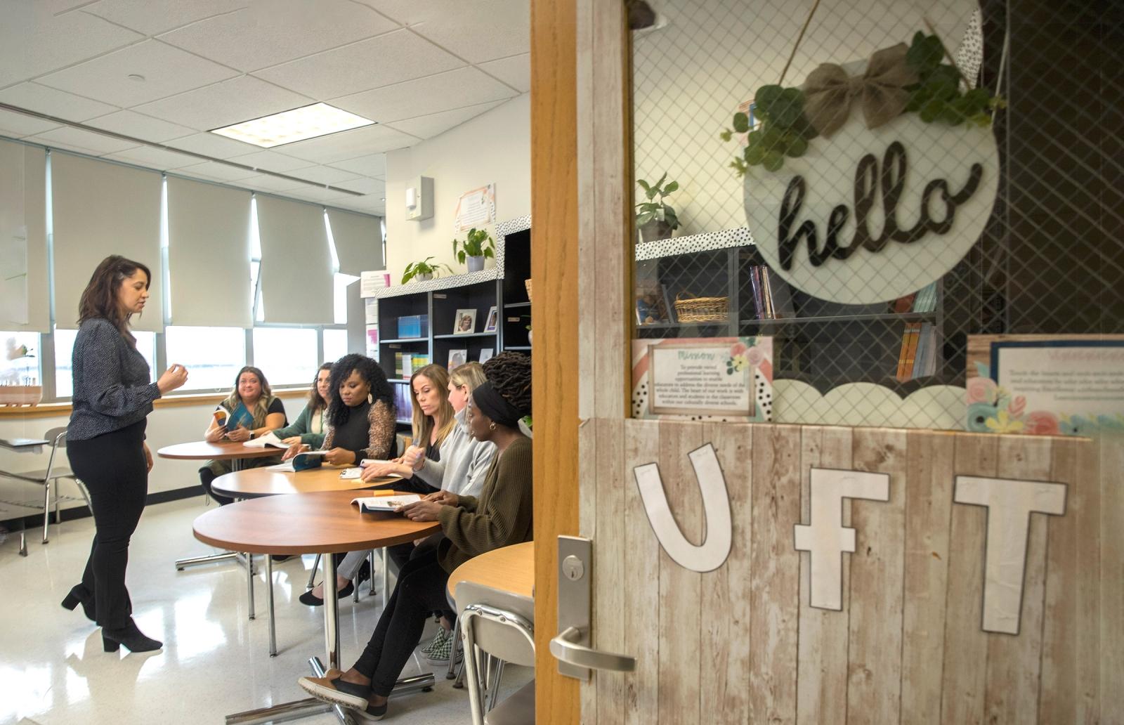Educators at the Longwood Academy of Discovery meet in the new Teacher Center.