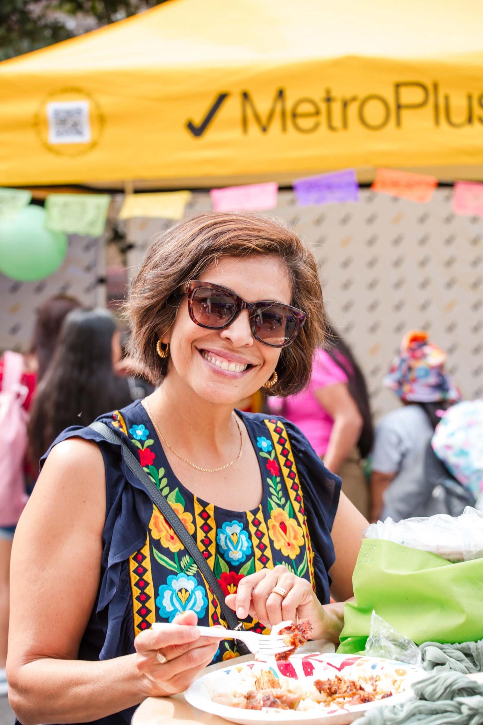 Irene Oliva-Sutherlann, a paraprofessional at the school, enjoys a plate of Latin cuisine as she relishes the chance to engage with students and parents outside the classroom.