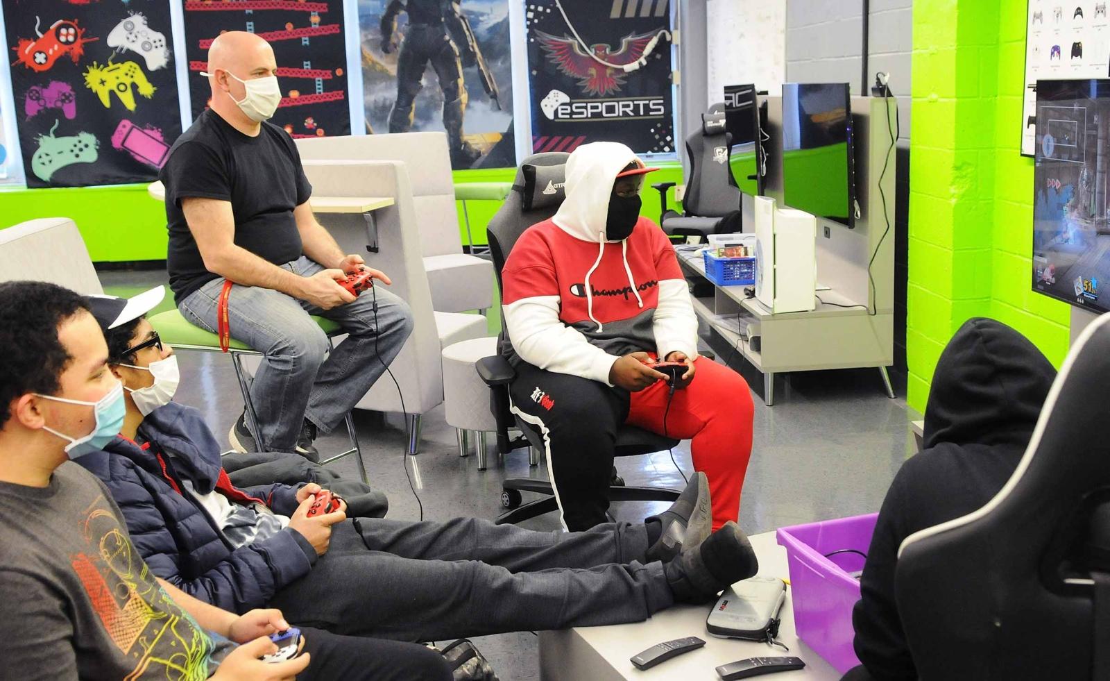 William E. Grady Career and Technical Education HS teacher Peter Cozeolino (third from left) joins some of the club members in a game of Smash Bros.
