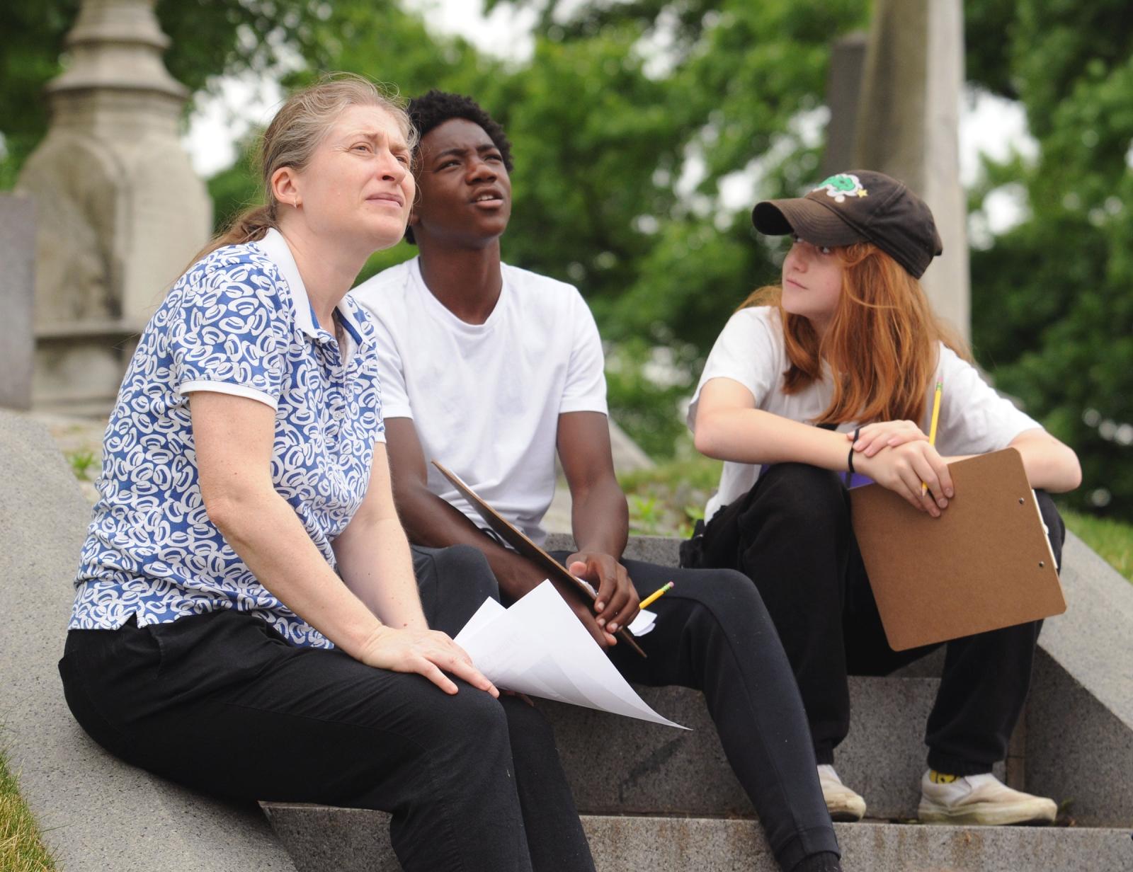 Girdo and two of her Park Slope Collegiate students survey the Green-Wood Cemetery during their architectural tour.