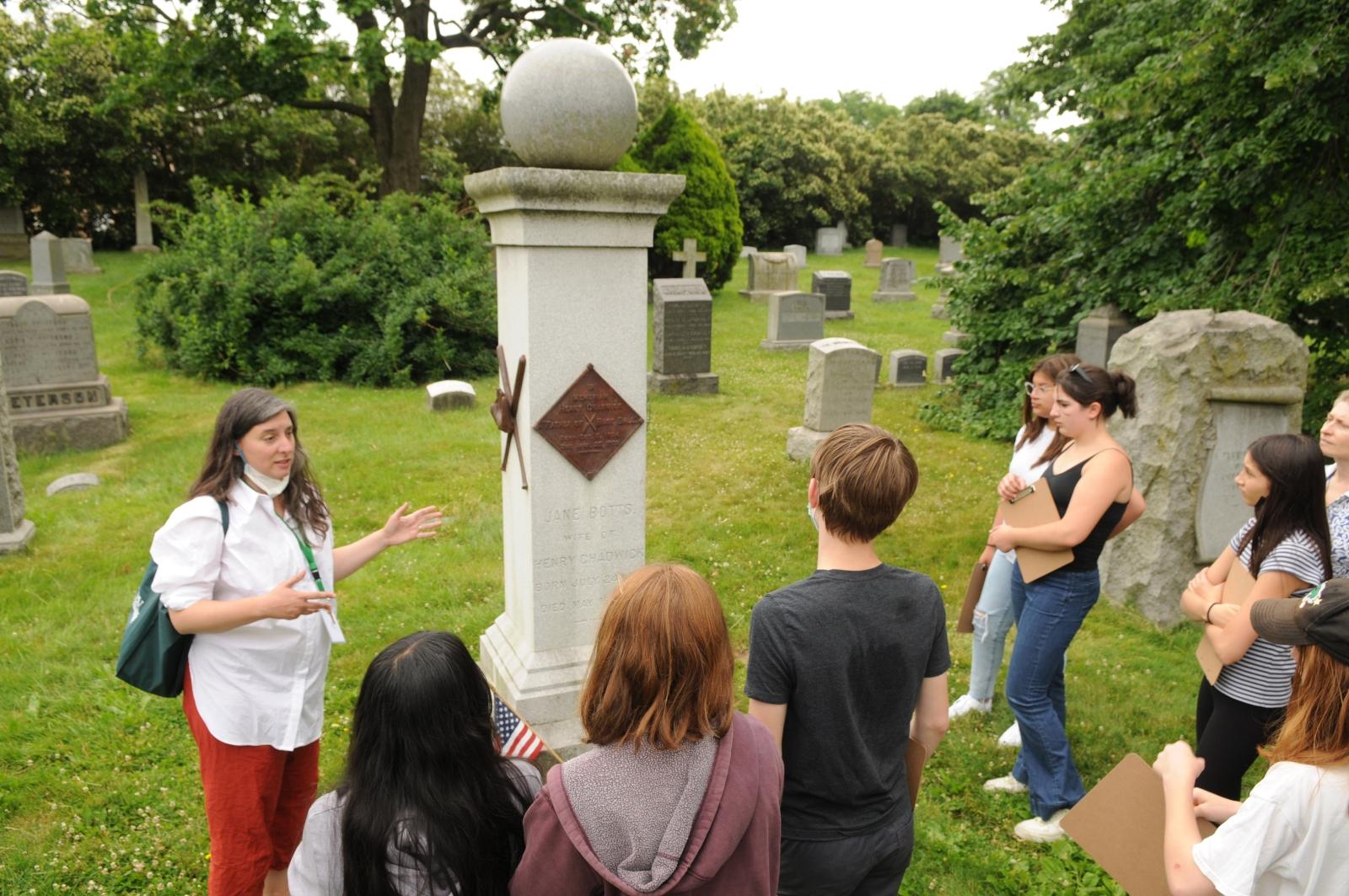 Rachel Walman, Green-Wood’s education director, introduces Park Slope Collegiate 7th-graders to the final resting place of Henry Chadwick, often called the father of baseball because he helped popularize the sport and create its rules.