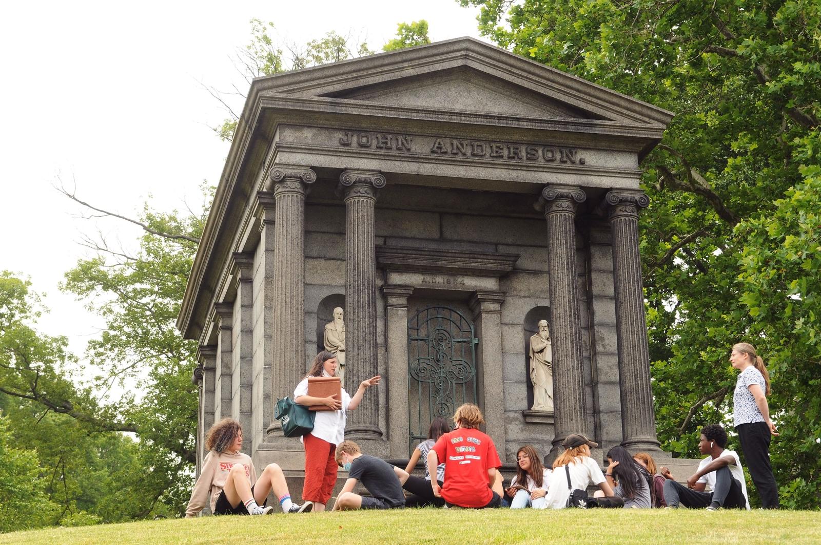 Green-Wood’s education director speaks with students and math teacher Yelena Girdo from Park Slope Collegiate MS/HS about the architectural style of wealthy tobacconist John Anderson’s mausoleum.