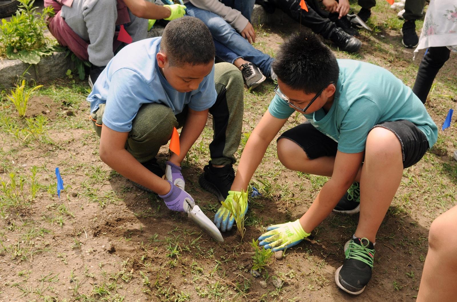 Two 6th-graders from MS 821 in the Sunset Park section of Brooklyn plant coreopsis at the Green-Wood Cemetery on June 21 as the finale to an educational tour about how pollination works.