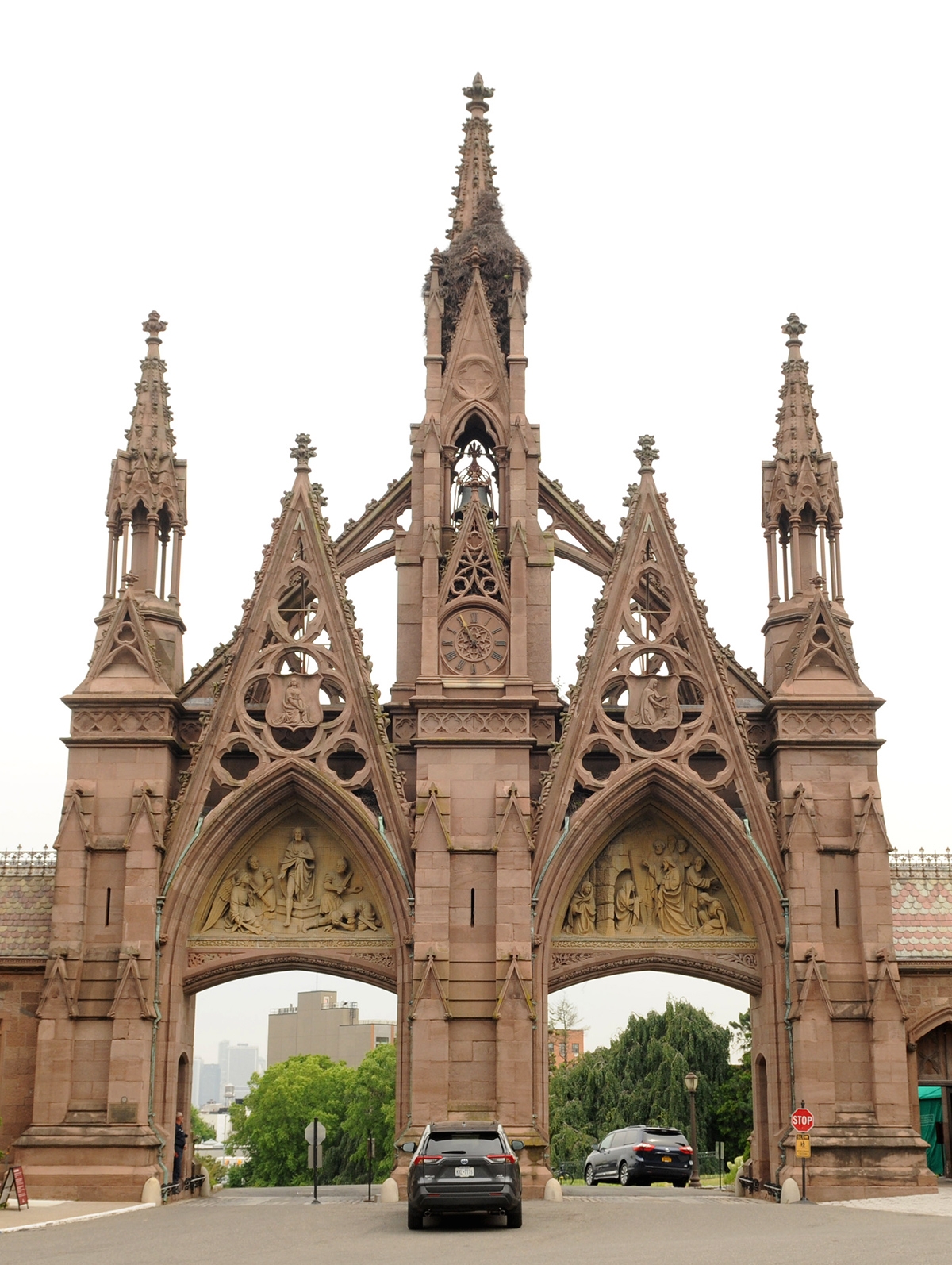 The Gothic Revival gate welcomes visitors to the main entrance of the Green-Wood Cemetery and is also home to a colony of monk parakeets.