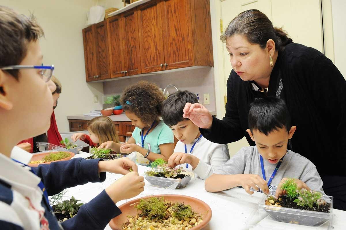 Tiny hands plunged first into great bowls of gravel, to provide drainage for their terrariums, and then into bowls of soil as the young scientists put all the ideas they had just been talking about into play.