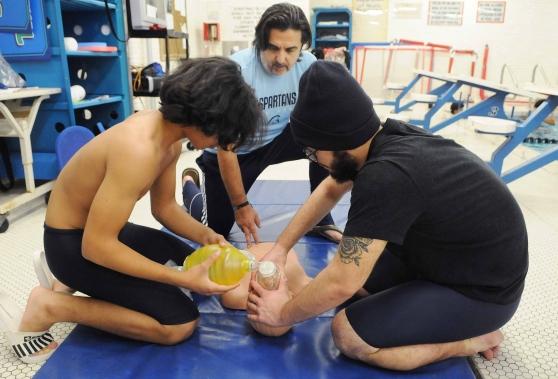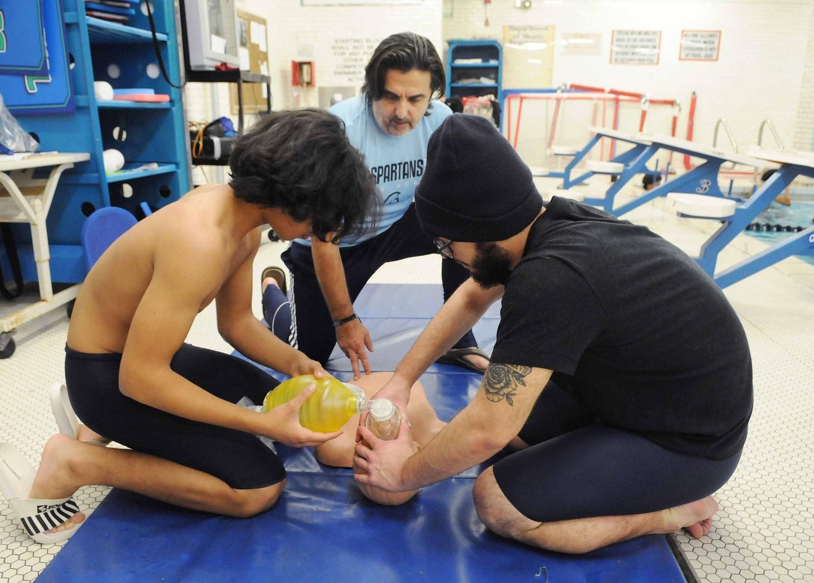 Coach Alex Navarrete gives instruction on how to use a bag valve mask, which he used to save a drowning student.