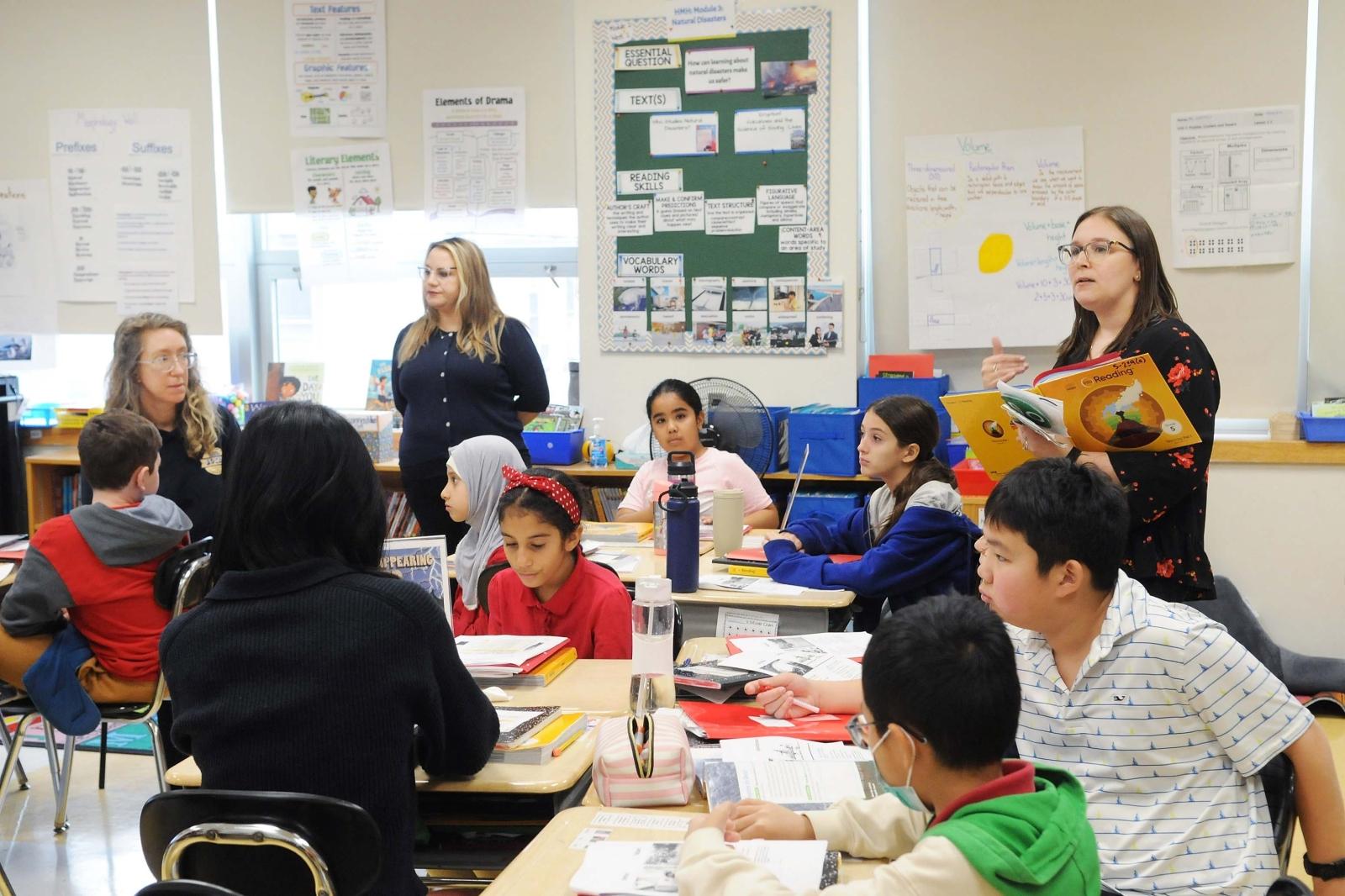 Speech therapist Liza Trinkle (seated, left), paraprofessional Maria Lattanzi and co-teacher Sarah Harrow (right) are part of the educational team for their 5th-grade integrated co-teaching Nest class at PS 682 in Brooklyn.