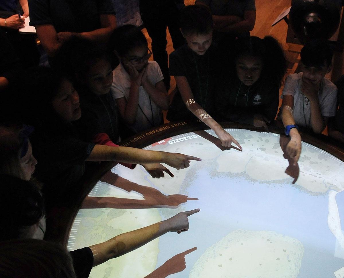 At an interactive map of the Naval Yard, students put their hands over an area to see how it looked in different eras, from the 1600s to today. Before their eyes, the area went from green space to streets, from an agricultural town to an industrial city. “We’re looking at things that have changed and been repurposed, and how New York itself has changed and been repurposed,” said Saltzman.
