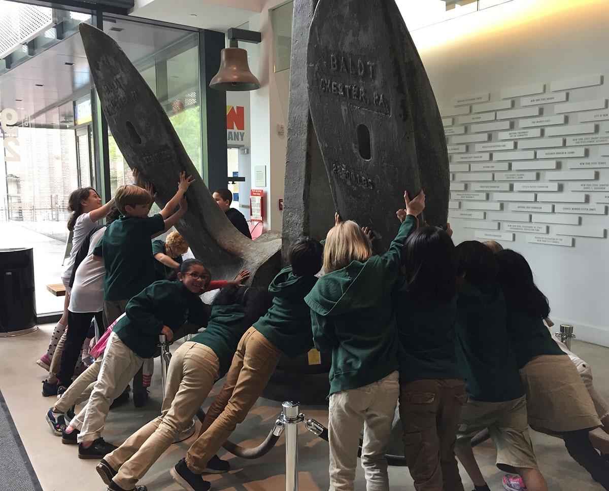 As Yokasta Evans-Lora’s class from the Brooklyn Arbor School in nearby Williamsburg arrives on June 13, teacher and students are met by high-energy museum educator Rebecca Saltzman. “How many pounds does this anchor weigh?” she asks the 3rd-graders, who can’t resist touching it and attempting to push it.