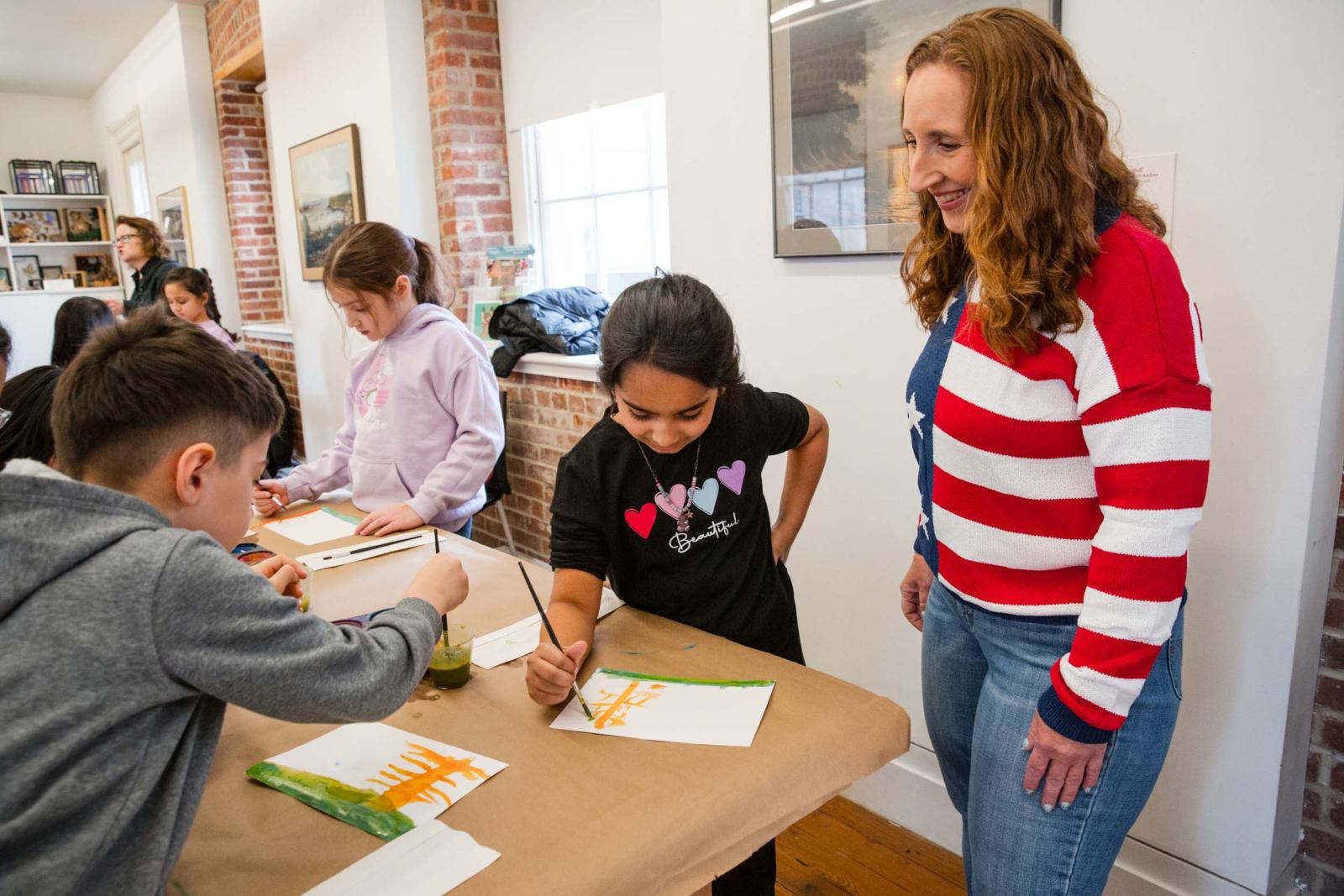 Teacher Jacqueline Velten of PS 54 on Staten Island smiles as she watches two of her 2nd-graders add details to their orange trees during a class trip to the Staten Island Museum that included painting watercolors and viewing paintings.