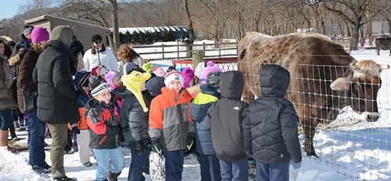 When their squares were complete, the kindergartners had one more important stop to make before getting back on the bus: to see the cow. After bundling up in their coats, hats and mittens, they eagerly trooped out into the snow, enthusiastically discussing their trip back in time.