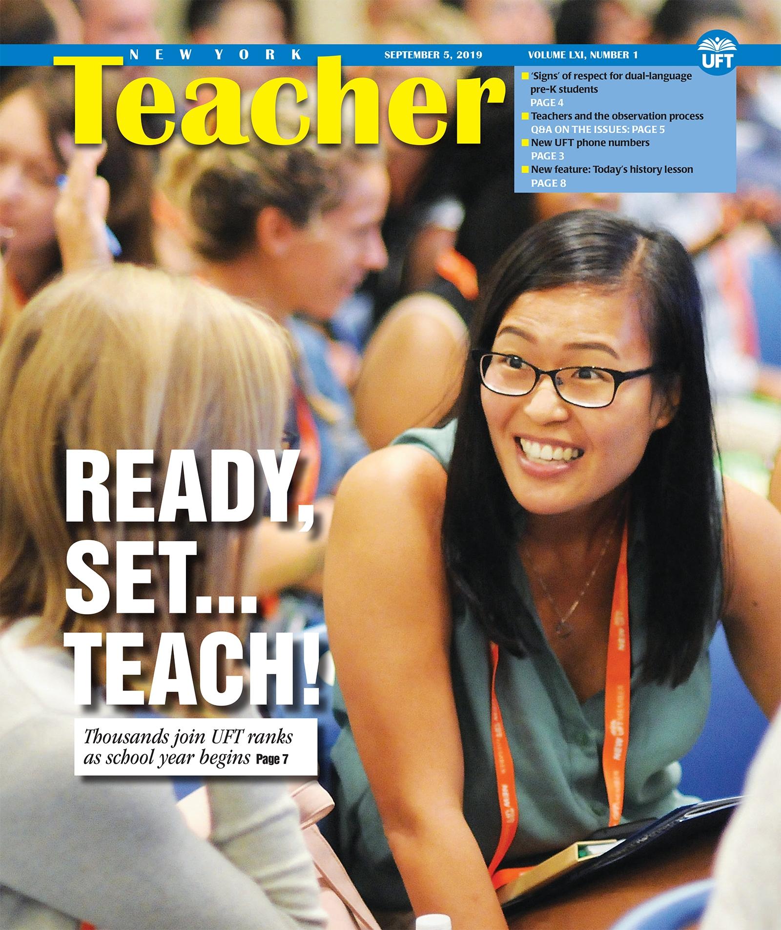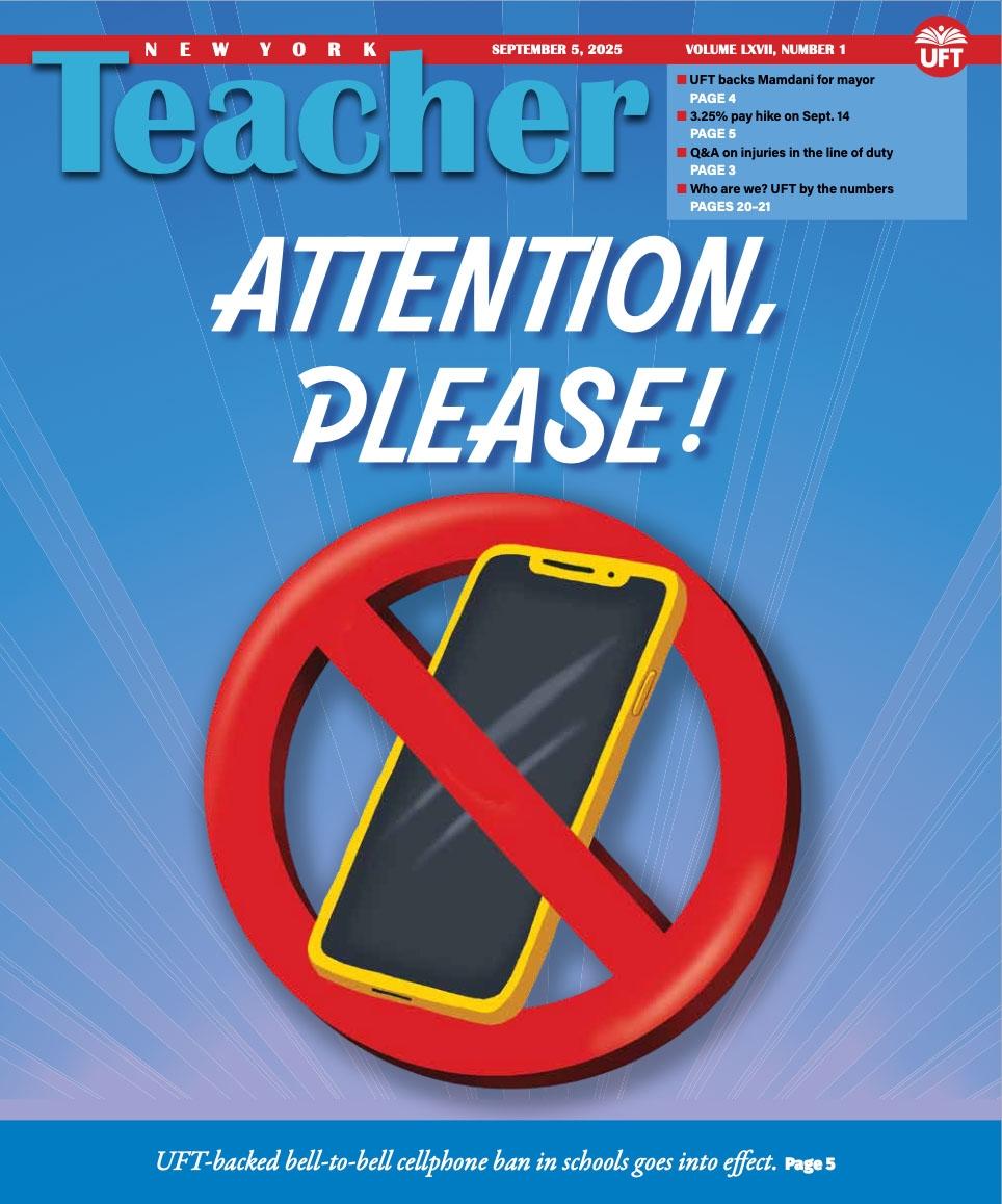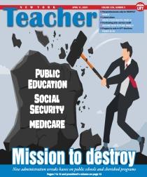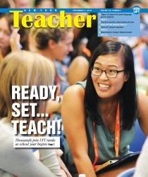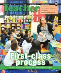Justine Shishkoff of PS 135 in Queens drops her ballot in the box during the chapter’s UFT contract vote last June.